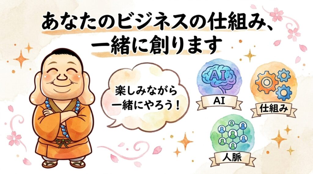 一過性の売上や、たまたま来たお客様に頼るのではなく、毎月安定して積み上がる仕組み。それをAI×人脈×経験で、楽しみながら仲間と一緒にビジネスを形にしていきます。