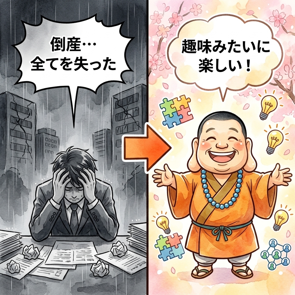 30年以上「裏方の企画屋」として経営者を支え、船井幸雄氏の一言をきっかけに会社を設立。しかし10年以上の苦闘の末に倒産。全てを失いました。