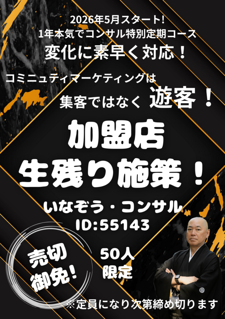まずはいなぞうとの面談を行い、お互いの「ご縁(エニシ)」と「覚悟」を確認した上での正式参加となります。 変化の足音は、すぐそこまで来ています。 その変化を「恐怖」として迎えるか、「飛躍のチャンス」として面白がるか。 本気で未来を変えたい、あなたとの面談を楽しみにしています。 一緒に、新しい時代の設計図を描きましょう。
